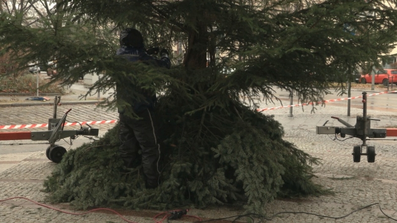 Eine klassische Beobachtung einer Tanne, die mit Lichterketten versehen wird. 12 Meter hoch ist der “geduldige Baum”, der Wind und Regen trotzt bis die 900 Meter Lichterketten um seine Äste geschlungen sind.
